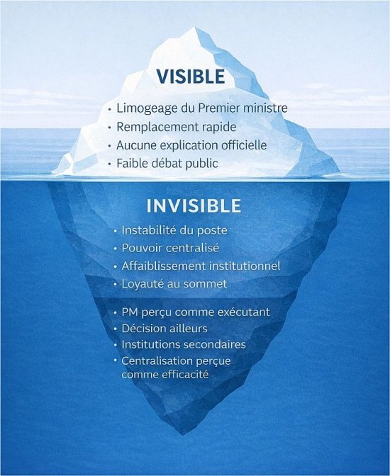 Mais que devient ce rôle lorsqu’il peut être interrompue sans motif explicite, dans un délai aussi court, le Premier ministre pouvant alors être remplacé par une figure sans base politique identifiable ?